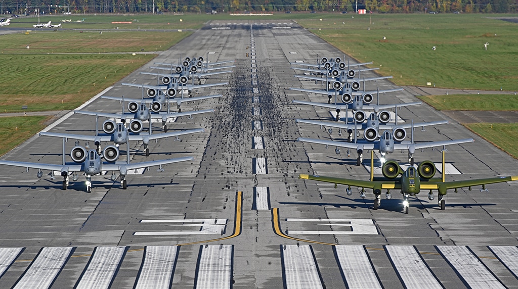 16 A-10 Warthogs took part in a Mission Generation Exercise and staged a nice “Elephant Walk”.