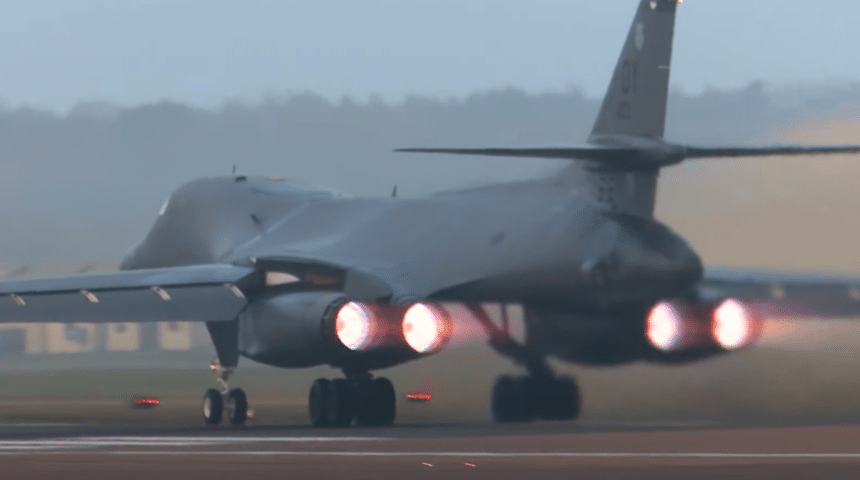 The following clip is more recent. It was filmed on Nov. 10, as the B-1s were launching. Apart from being, as usual, a spectacular departure you also get a glimpse at the vortex generate by the far right engine’s air intake. Pretty interesting!