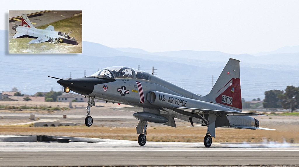 Based on the same photographs, we can determine that one of the aircraft involved in the incident is the specially painted T-38C of the 87th Flying Training Squadron (FTS) “Redbulls” (serial 68-8121) that was given a heritage livery similar to the one used on the F-106A Delta Darts jets the 87th Fighter Interceptor Squadron from K.I. Sawyer AFB (Michigan) from 1968 to 1985.