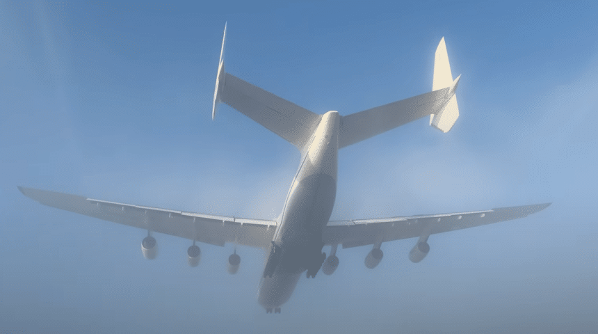 Watch the effect of the giant Antonov An-225 Mriya on fog during final approach.