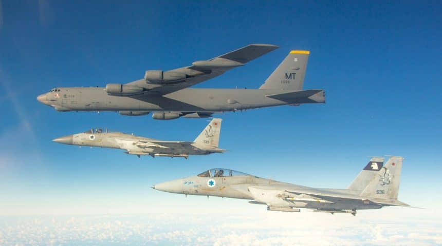 Following the successful completion of the patrol, the B-52 begun tracing back its route. While flying near Israel, the BUFF (Big Ugly Fat Fellow) was joined by two IDF F-15s and a camera ship. The two fighters were possibly on Quick Reaction Alert duties, as photos show them armed with live Python 4/5, AIM-7 Sparrow and AIM-120 AMRAAM air-to-air missiles like during a similar flight last year (which, by the way, saw exactly the same bomber flying over Israel).