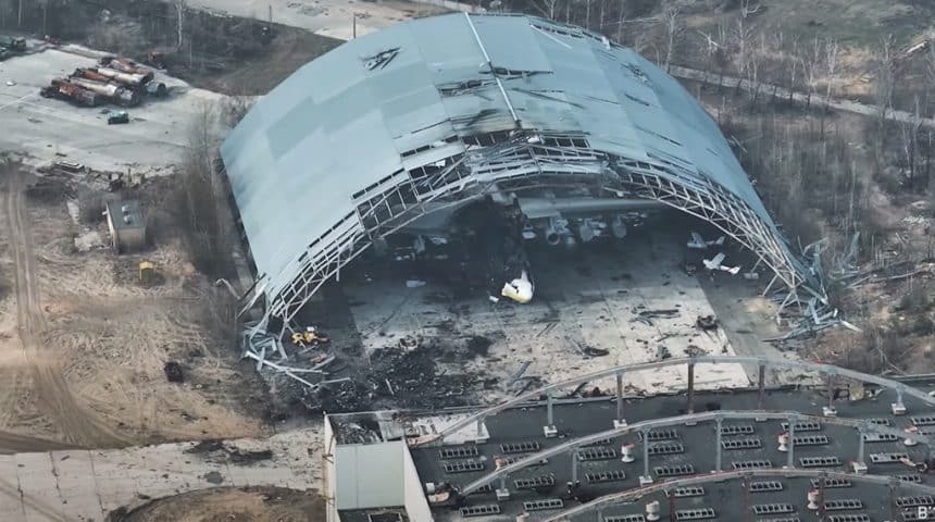 Although the withdrawal of some Russian forces from the area around the Ukrainian capital is seen by the Western intelligence as a “major” strategy shift by Moscow, and troops could be reversed again if the battle conditions allow, the liberation of Hostomel allowed a Ukrainian cinematographic company to launch a drone over the airport and film the widespread devastation at Antonov Airport, where a fierce battle between Ukrainian Armed Forces and Russians took place between Feb. 25 and 26, during the opening phases of the Russian invasion of Ukraine.