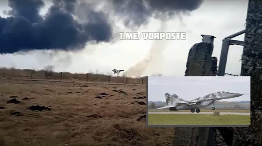 A short video surfaced online just few days ago showing the Ukrainian countryside being shelled by Russian artillery, with dense smoke columns on the horizon. About halfway through the video, a MiG-29 appears taking off just seconds before the artillery struck the runway. Even if the video is not very high quality, the aircraft seems to be painted in the Ukrainian Air Force pixelated camouflage.