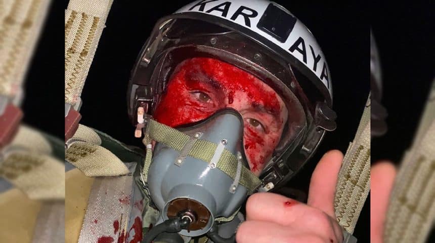 Although some of his images had already got a lot of attention, Karaya’s last post is something never seen before and as such, went immediately viral: he managed to snap a selfie of his blood-covered face while descending under his parachute canopy after ejecting over west-central Ukraine.
