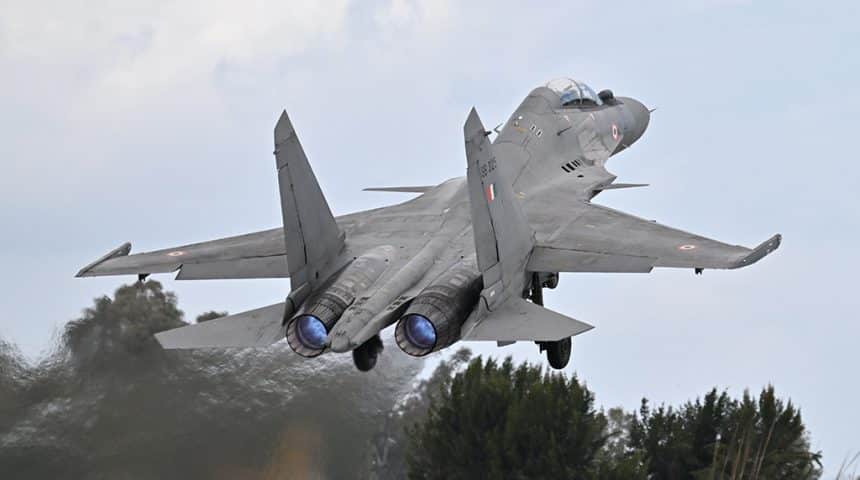 The Su-30MKI is a two-seat multirole derivative of the Su-27 Flanker, a fighter in the same class of the U.S. F-14ย andย F-15, with impressive maneuverability as shown by its ability to perform the โPugachev Cobraโ: in a “Cobra”, the plane suddenly raises the nose to the veritical position (or beyond) before dropping it back to the normal flight, maintaining more or less the same altitude through the entire maneuver. The Su-27 and its โCobraโ have been the highlight of many air shows from the end of the 1980s to the middle of the 1990s. But, since then, the Flanker maneuverability has been furtherly enhanced. Indeed, the improved multirole Su-30MKI is a Flanker variant fitted with both canard forewings and thrust-vectoring nozzles which have improved its agility.