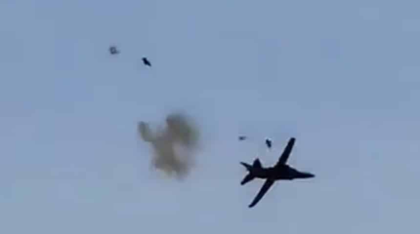 Videos circulating on social media show the MiG-23UB on a left turn at low altitude before the two crew members eject.