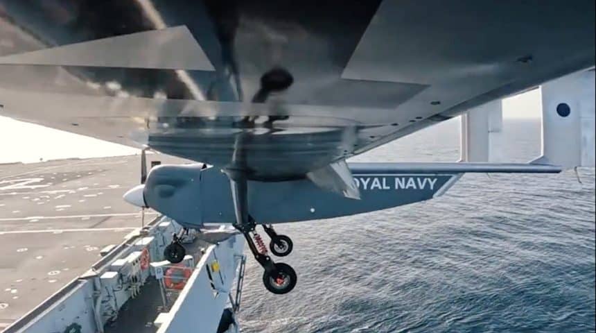 The 10m wingspan drone flew from the Predannack RNAS Culdrose to the carrier out on the Cornish coast and back, delivering supplies to the ship. The twin-engine drone is capable of landing on a mere 150m of runway, which is roughly half of the Queen Elizabeth class carrierโs flight deck.
