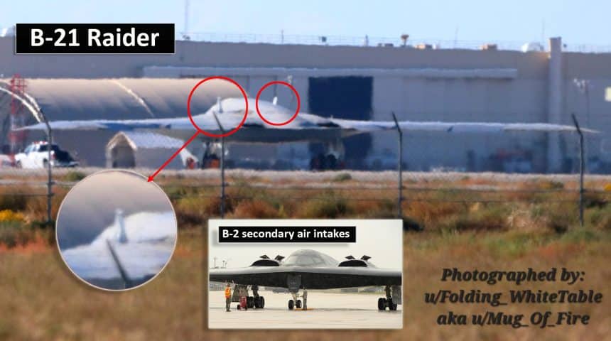 The Reddit user who posted the first image of the B-21’s rear end has now uploaded new high resolution images. The photos show what appear to be open auxiliary air intakes.