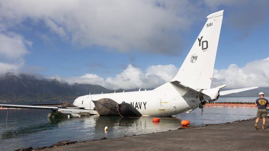 A complex operation to recover the P-8A Poseidon thatย ended in water after overshooting the runway during landing at Marine Corps Air Station Kaneohe Bay, Hawaii, is currently underway. Theย P-8A 169561 YD-561, belonging to the VP-4 โSkinny Dragonsโ based at Naval Air Station Whidbey Island, Washington, came to rest around 50ft offshore, sitting on its nose and main landing gear on coral while also maintaining most of its buoyancy.