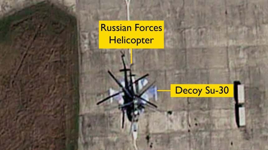 Russian helicopters are disrupting Moscow’s efforts to deceive Ukraine using decoys, by landing on the dummy fighter jets painted on the concrete.