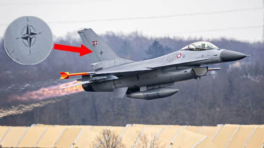 Images shared by the RDAF on social media show the F-16AM E-190 from the Fighter Wing Skrydstrup. taking off with the NATO marking.
