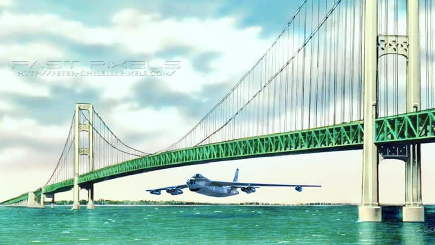 A U.S. Air Force RB-47E Stratojet reconnaissance aircraft piloted by Strategic Air Command pilot Capt. John Stanley Lappo was said to have flown underneath the Mackinaw Bridge where Lake Michigan and Lake Huron converge. As history records the event, no photos of the aircraft flying under the bridge exist, but the stunt, if it actually did happen, created enough buzz that a legend was born.