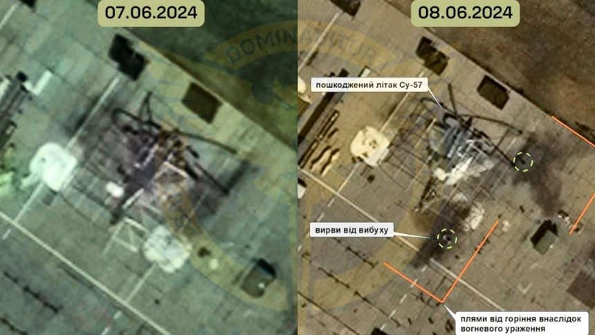 โThe pictures show that on June 7th, the Su-57 was standing intact, and on the eighth, there were ruptures from the explosion and characteristic spots of fire caused by fire damage near it,โ says the GUR.