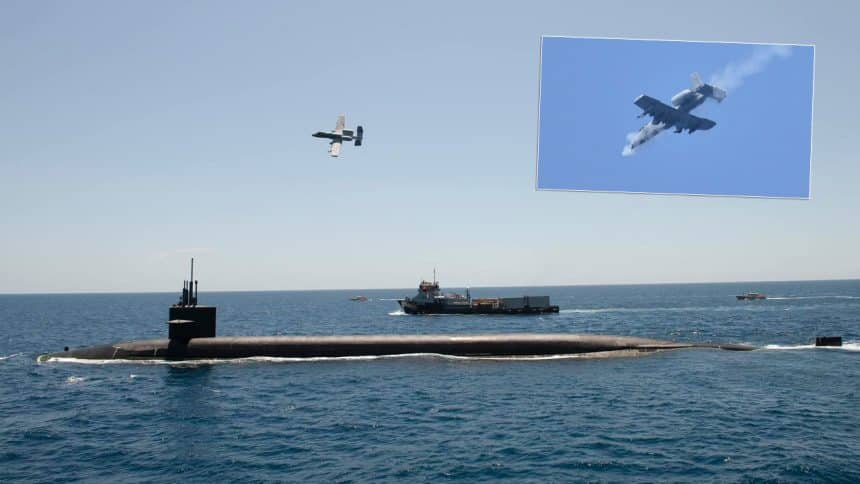 A formation of A-10C Thunderbolt II close-air support aircraft were employed once again to escort an Ohio-class ballistic missile submarine, the USS Wyoming (SSBN 742). The images, shared on social media by Submarine Group Ten, depict Wyoming and its escorts navigating in an undisclosed location in the United States, with six A-10Cs flying overhead.