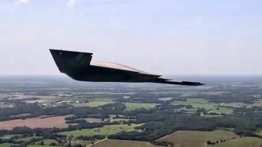 The clip, shot from an echelon left position shows the B-2 flying a low level visual pattern around Whiteman with the T-38s.