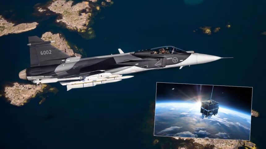 Sweden is studying the feasibility of launching a small satellite from a Saab Gripen multirole fighter jet, the Swedish Air Force revealed last week at the Farnborough Air Show. This follows its new armed forces space strategy and complements its dispersed operations concept that dictates both its military doctrine and the Gripenโs own design philosophy and tactical orientation.