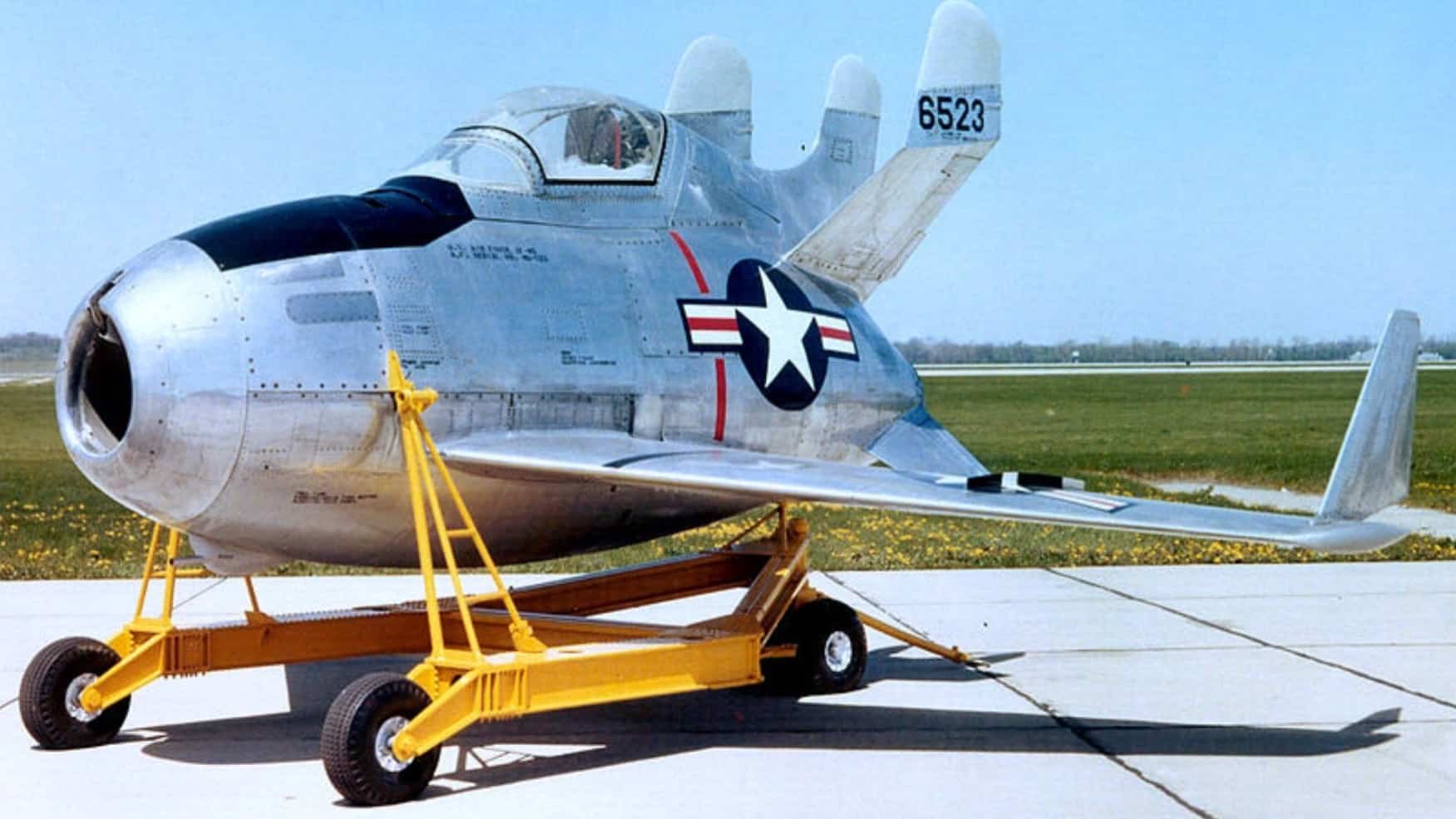 Designed primarily to defend the gigantic Convair B-36 and Northrop’s planed B-35 flying wing bomber, the XF-85 project began with two prototypes in 1947 built by McDonnell Aircraft. It was named the “Goblin.”