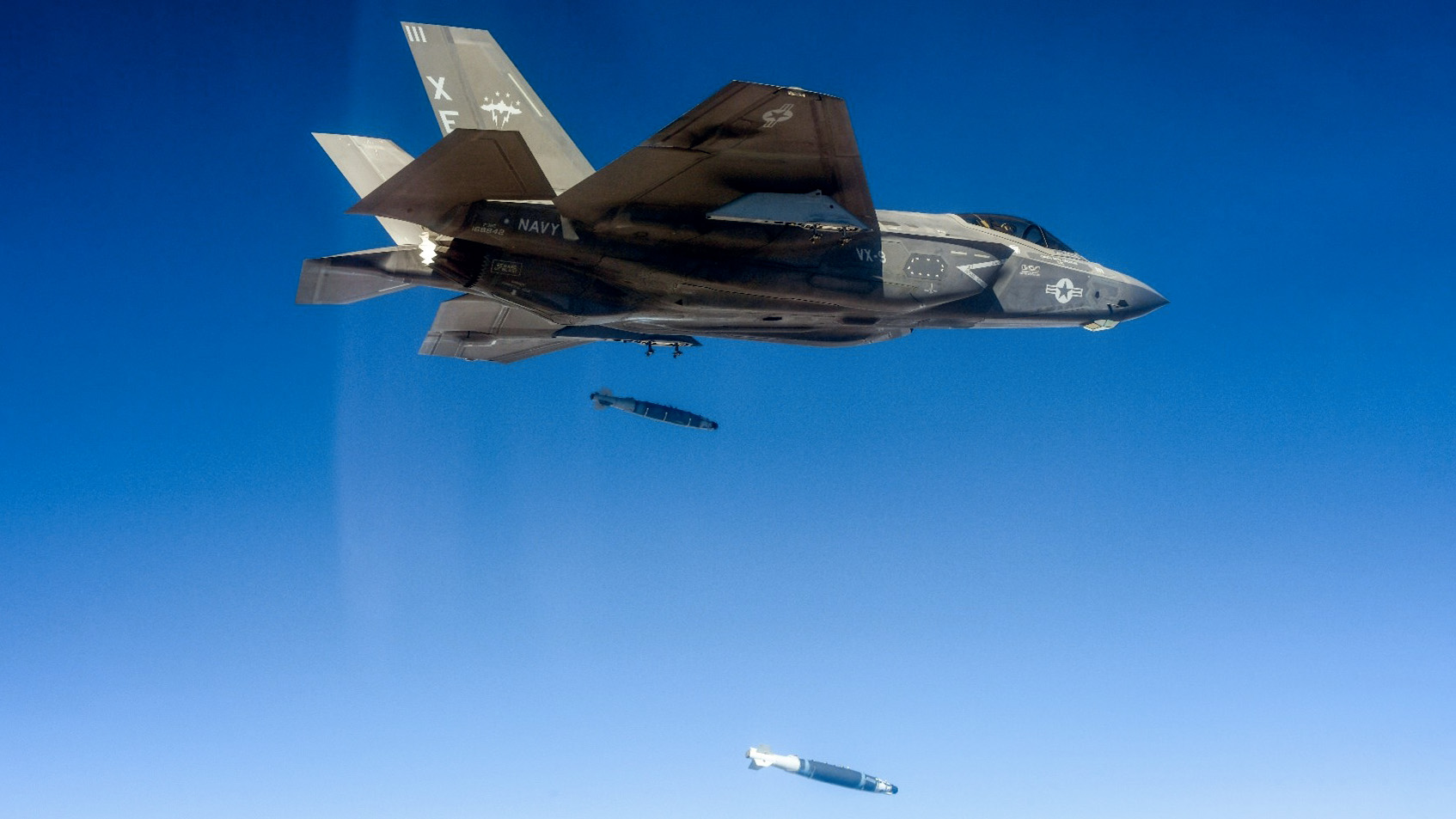 An F-35C of VX-9 assigned to the United Operational Test Team at Edwards AFB performed the first dual drop of externally mounted GBU-54 LJDAM bombs, engaging a remote controlled High-Speed Moving Target.