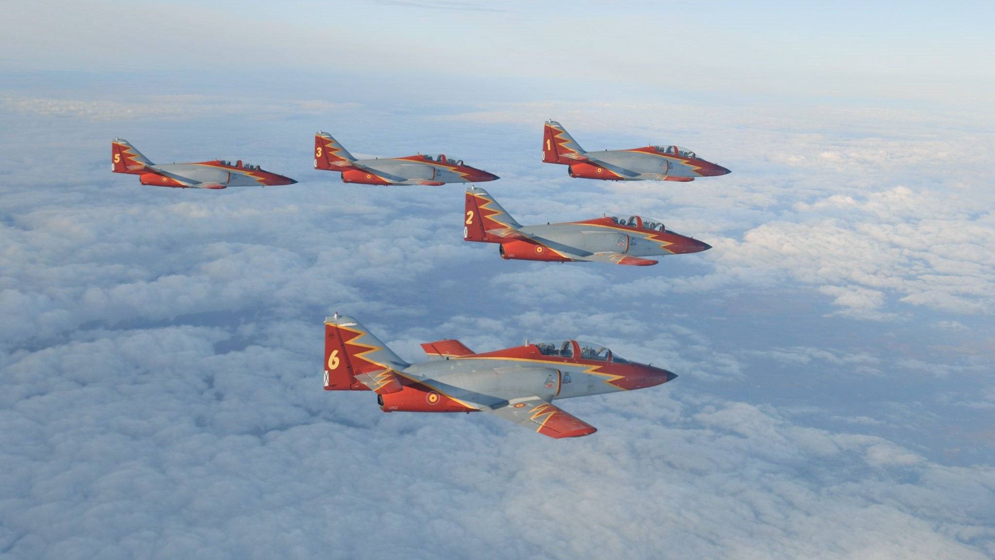 The team, based at the AGA (General Air Academy) in San Javier, was formed on Jul. 4, 1985, and has used the C-101s since its inception. The team is assigned 17 C-101s, although in demonstrations only seven fly at one time. The team is famous for their formation landings, as well as being the only European team to use yellow smoke.