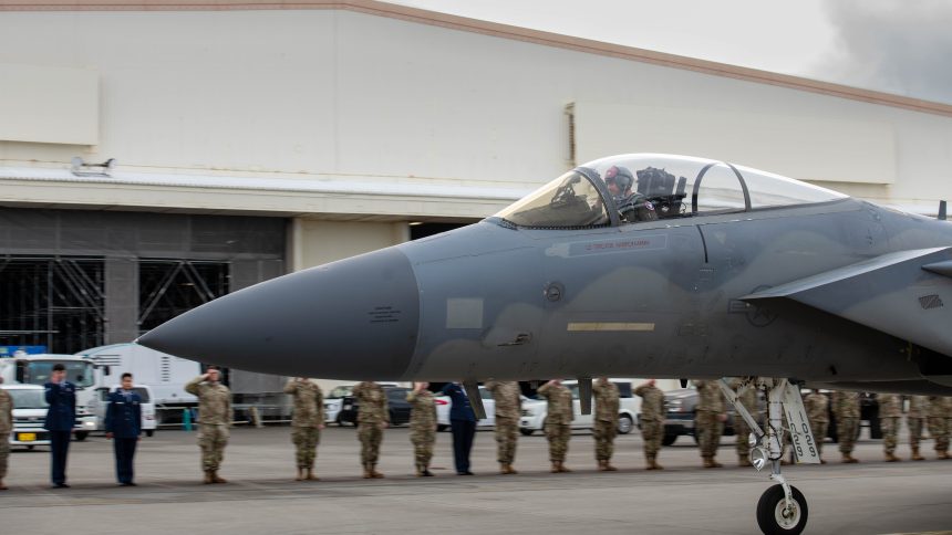 The jets that took part in the last flight received a ceremonial salute following the flight, and will be converted into a maintenance training aircraft. “We are using them to continue to train our weapons loaders and our maintainers, because there’s a lot of commonality between the F-15EX and the F-15C,” said the 18th Wing’s commander, Brig. Gen Nicholas Evans.