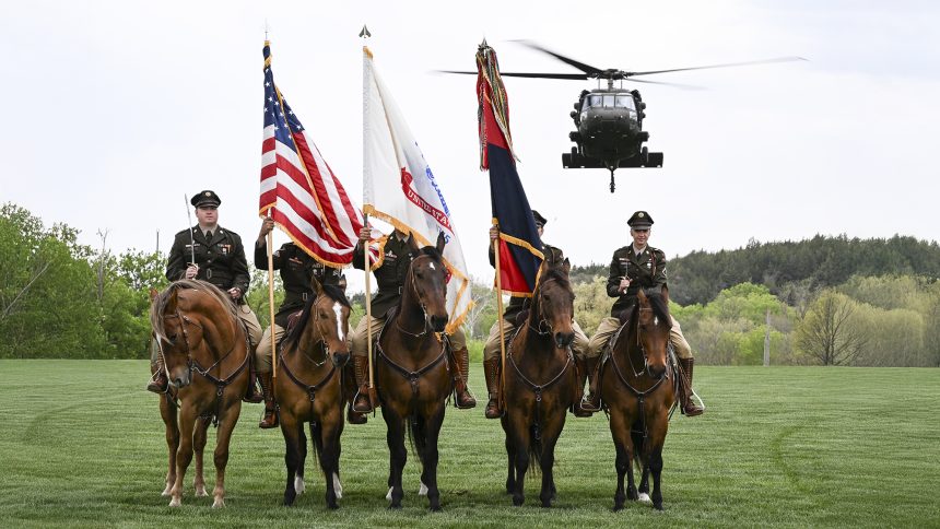 It’s not every day that noise from a helicopter is considered a good thing. Especially military helicopters like the AH-64 Apache Guardian and UH-60M Black Hawk. However, the noise was a beneficial training element recently for the U.S. Army’s 1st Infantry Division Commanding General’s Mounted Color Guard at Fort Riley, Kansas. The CGMCG is a detachment of highly trained horses and riders who represent the U.S. Army at community events at the local and even national level.