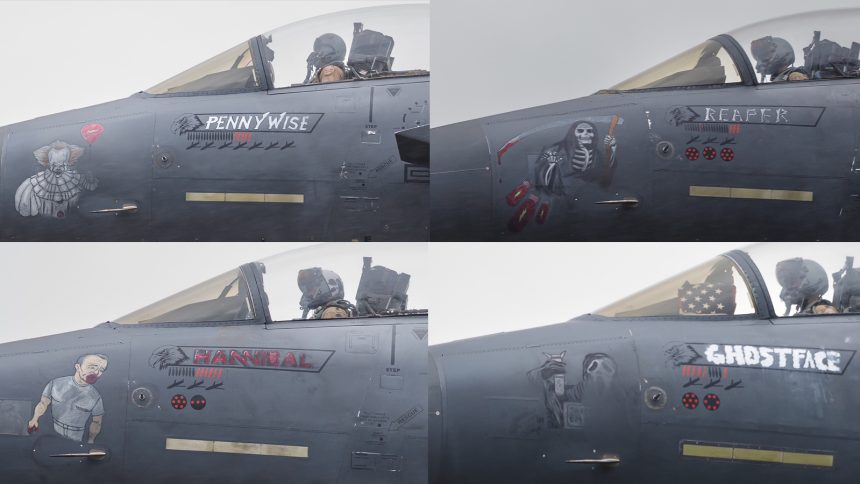 Besides the nose art featuring horror movie characters, these F-15Es also carried bomb markings similar to those observed on the eight aircraft from the first cell, which we covered in detail in our previous article here.