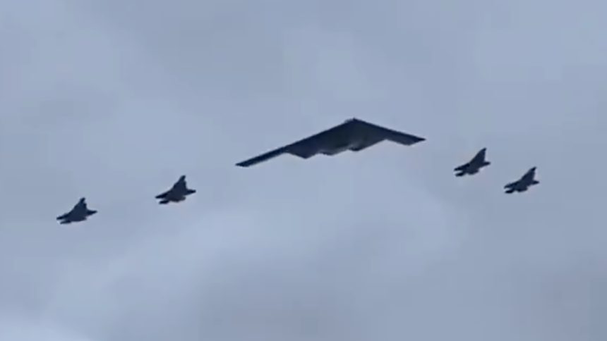 B-2 bomber and F-35s stage an impressive flyover watched by hundreds of thousands online as Trump and Putin meet in Anchorage.