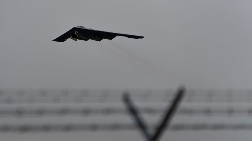 A U.S. Air Force B-2 Spirit aircraft departs Whiteman Air Force Base, Missouri, Oct. 7, 2025. (U.S. Air Force photo by Staff Sgt. Joshua Hastings)