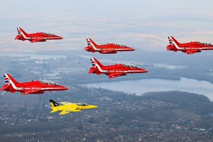 A vintage Folland Gnat flew in formation with the Red Arrows to…