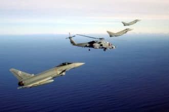 Behold This Somehow Funny Photo Of Three Italian Typhoon Jets Escorting a Danish Seahawk Helicopter