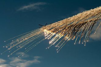 Helicopter creates rain of flares at dusk to fight winter depression in Denmark