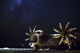 A lonely C-2 Greyhound sits on the flight deck of USS Enterprise…