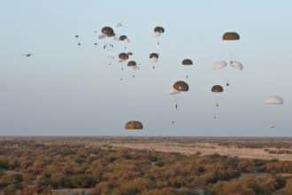 French Foreign Legion paradrop over Timbuktu, Mali. As seen from a drone.