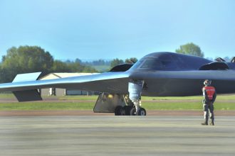 Two U.S. Air Force Global Strike Command B-2s performed a hot-pit refueling…