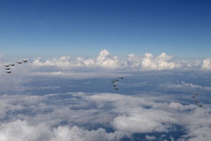 Raptors and Eagles and Typhoons flying together. A four-ship formation consisting of…