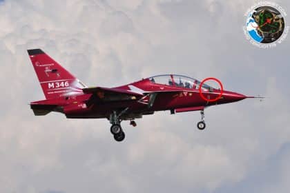 The M-346 flying with a "weird device" at the base of the canopy