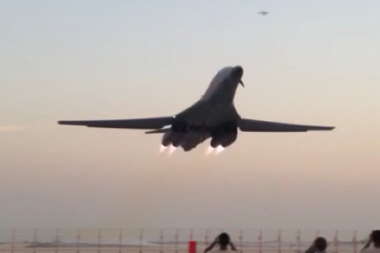 Watch a B-1 Lancer bomber buzz photographers on take off from Al Udeid airbase