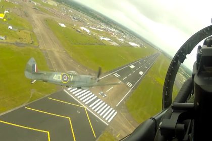 Join a RAF Typhoon jet as it forms up with a Spitfire during RIAT air display