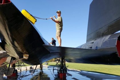 Photos show former Blackbird Maintainers cleaning the SR-71 on static display at Beale AFB