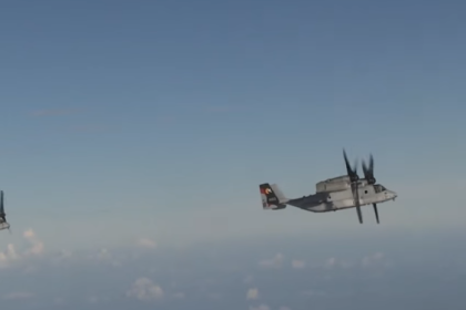 A U.S. Marine Corps Osprey tilt-rotor aircraft is depicted with seemingly solid…