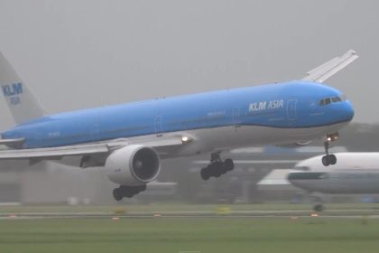 Watch a Boeing 777 bank sharply and land in a 120 km/h wind storm