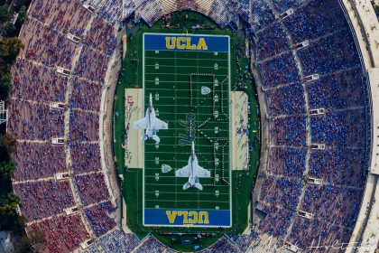 Two VFA-2 "Bounty Hunters" Super Hornet flying over the Rose Bowl as…