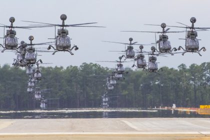 Record formation of 30 U.S. Army’s Kiowa helicopters performs farewell flight over Fort Bragg