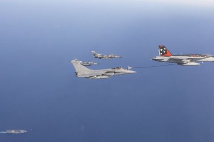 F/A-18E Super Hornet serves as aerial refueler for French combat planes operating…
