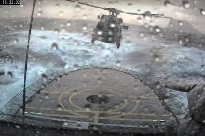 Incredible footage shows MH-60 Seahawk helicopter attempting to land on the pitching deck of a warship in rough seas