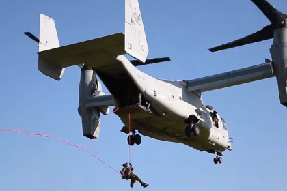 Watch this Osprey conducting rappelling and fast rope-training with USMC special operations…