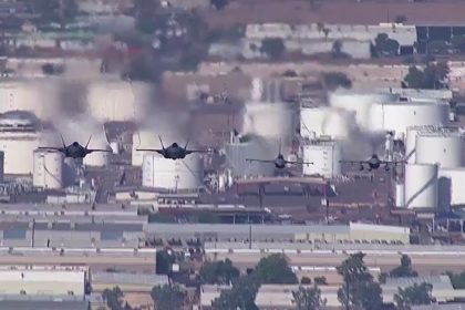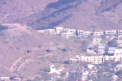 F-35 and F-16 Formation Doing Arizona State Capitol Flyover As Seen From A Helicopter