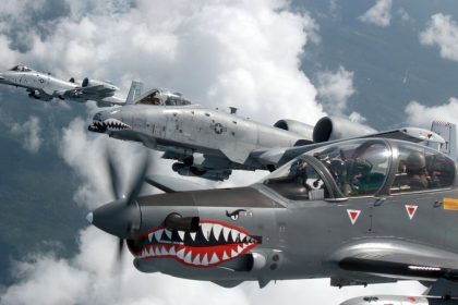 Sharkmouths! U.S. A-10 Warthogs and Colombian Air Force A-29B Super Tucanos fly together