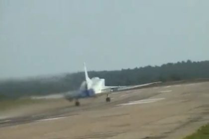 Close call: Russian Tu-22M Backfire bomber take off uses ALL of the runway