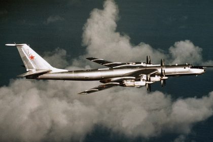 Two Russian Navy Tu-142 Bear-F long-range maritime patrol reconnaissance and anti-submarine warfare…